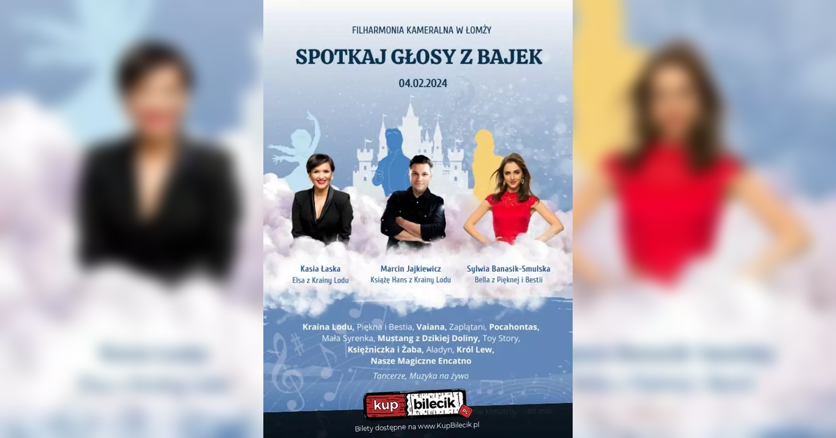 Ale to nie tylko koncert... Co jeszcze nas czeka? Piękne kostiumy, gra świateł i baniek mydlanych, możliwość zrobienia pamiątkowych zdjęć (bezpłatnie), interakcja z postaciami, a nawet wspólne śpiewanie! Usłyszymy oryginalne głosy Elsy, Hansa i Belli w największych przebojach z bajek takich jak: Kraina Lodu, Vaiana, Piękna i Bestia, Zaplątani, Mulan, Zwierzogród, Mała Syrenka, Mustang z Dzikiej Doliny, Toy Story, Księżniczka i Żaba, Aladyn, Król Lew, Nasze Magiczne Encanto Czego się spodziewać? głosów, które rzeczywiście są w bajkach tancerzy - ADS Studio z wyjątkowymi choreografiami efektów specjalnych interakcji w trakcie koncertu wspólnego śpiewania pięknych kreacji spotkania z postaciami z bajek po występie